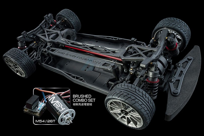 Comes with the car chassis, wheels, tires, clear body shell, motor, ESC, and transceiver.