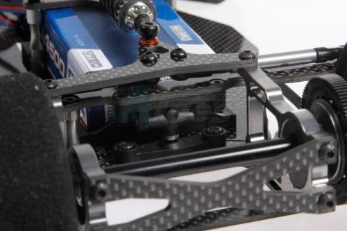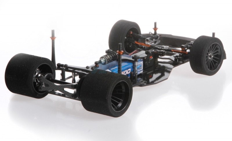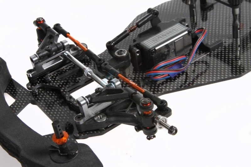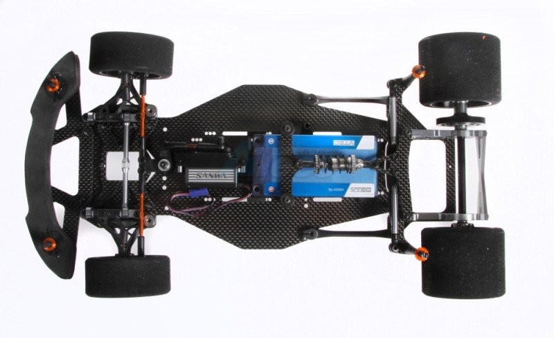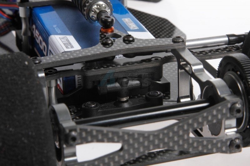 The strong basis is formed by the 2.5mm thick carbon fibre chassis plate with supports enabling a forward or backward battery position, and enough space for all the valuable electronics.