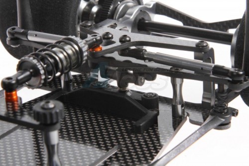 The front end of the car features 11 different adjustments to help you get the most from your car, all of which are easy to adjust and measure. Fixed lower suspension arms are themselves damped by the central strut which uses rubber o-rings to take up the flex in this area, while the grey anodised aluminium front upper wishbone mounts are available in different caster angles, the car being supplied with 6 degree version as standard. With the steering block king pins spring loaded, the cornering forces are channelled through the upper wishbone, which enable the car to corner at high speeds.