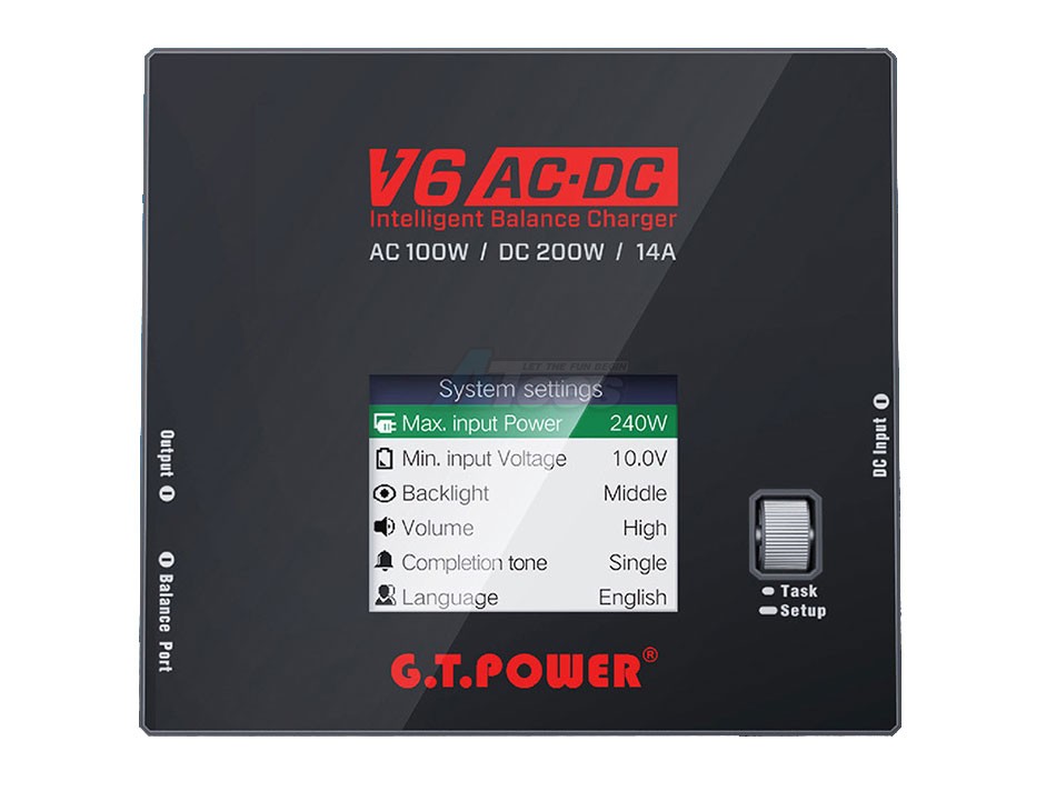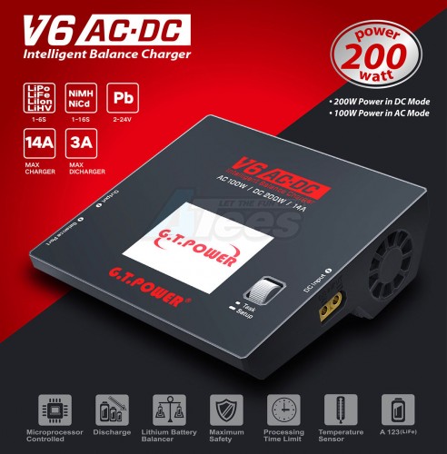 - Factory description: G.T. Power V6 AC/DC 100W/200W 14A Intelligent Balance Charger