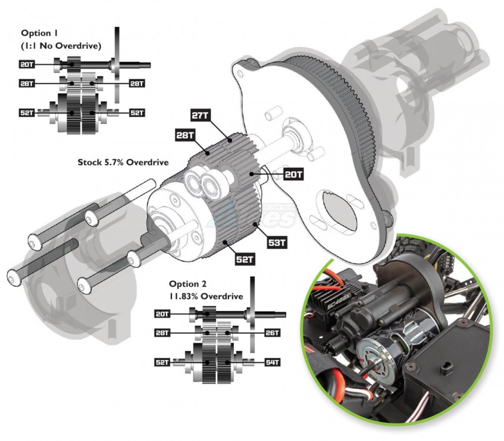 Option 2 (with 26T and 54T gears, below right) overdrives the front end 11.83% (included in RTR).