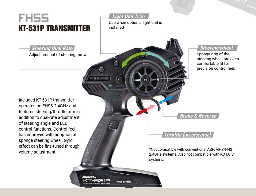 Kyosho is one of the oldest model rc car makers in Japan, it was created in October, 1963. Kyosho produces a wide variety of products, including radio-controlled cars, planes, helicopters, and boats. Kyosho has avoided direct competition against their biggest competitor, Tamiya, in the hobby grade RC cars market since the 1980s, where Tamiya was the most active brand, instead, Kyosho were focusing on designing professional 1/8 scale racing buggies, Mini-Z series, and RC helicopters; areas in which Kyosho dominates today. The company is best known for its 1/8 scale competition buggies, Mini-Z series, and RC helicopters, but it also produces remote-controlled bipedal robots in the Manoi series.All the upgrade of their cars are available here at the largest online RC store.