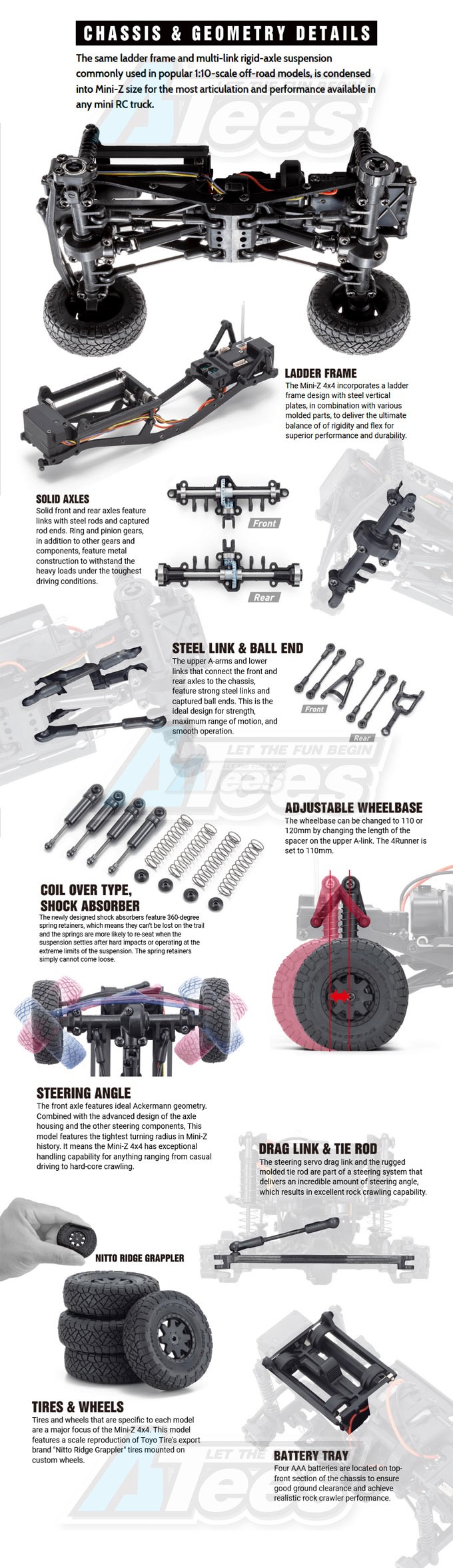 Features:- The Mini-Z 4X4 uses a ladder frame design with steel vertical plates to deliver the ultimate balance of rigidity and flex for superior performance and durability.