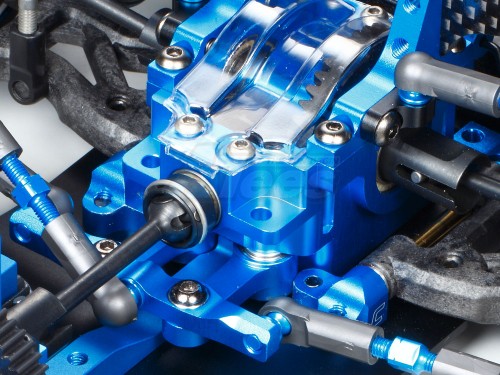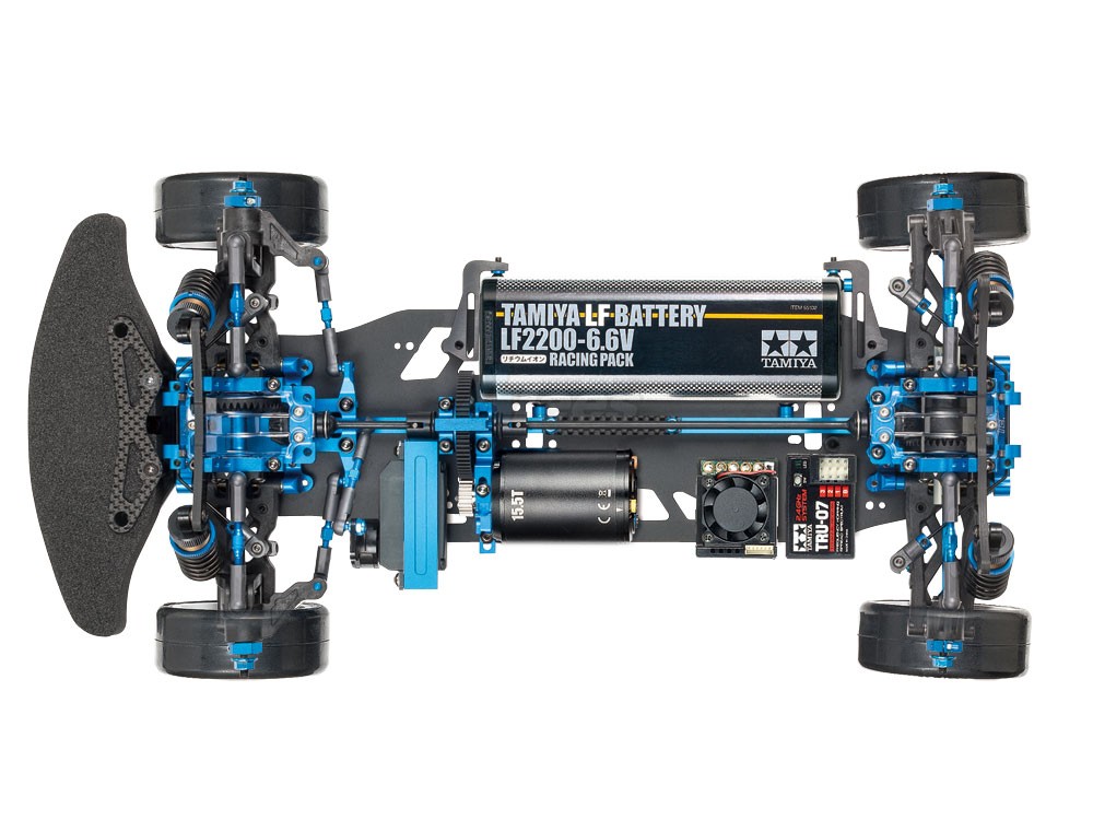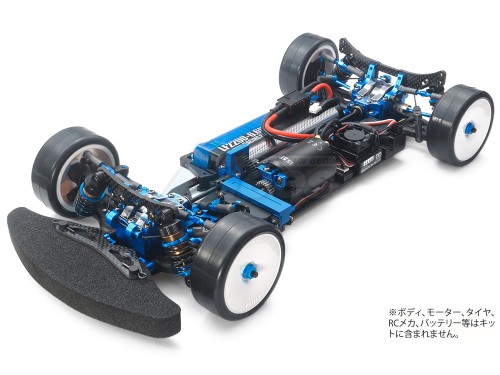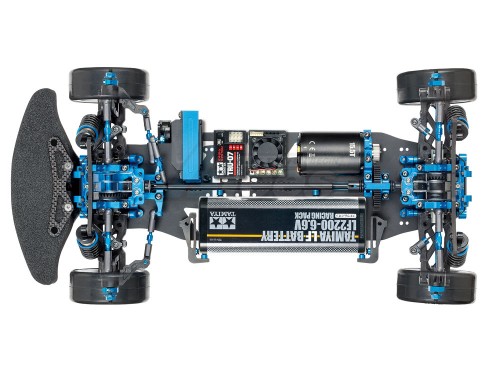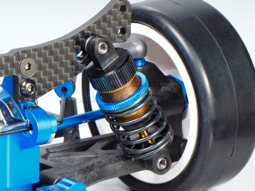 The steering linkage is affixed to the bulkhead mount, removing any impact upon chassis roll. A front direct coupling is paired with double cardan drive shafts, and the rear employs a gear differential unit. Suspension uses high performance TRF super short big bore dampers.