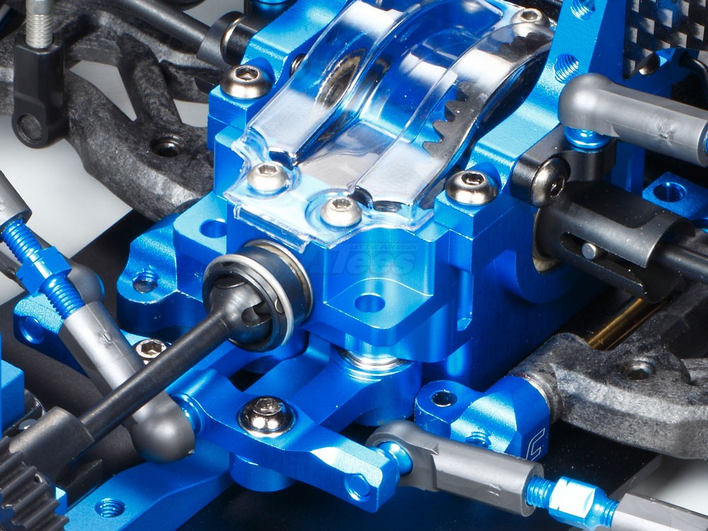 • This high performance shaft-driven 4WD chassis utilizes a 2mm thick aluminum lower deck with center stiffener for a blend of rigid pitch damping and flexible roll. Three different motor positions allow adaptation to a range of courses, while the lack of an upper deck lowers the center of gravity.