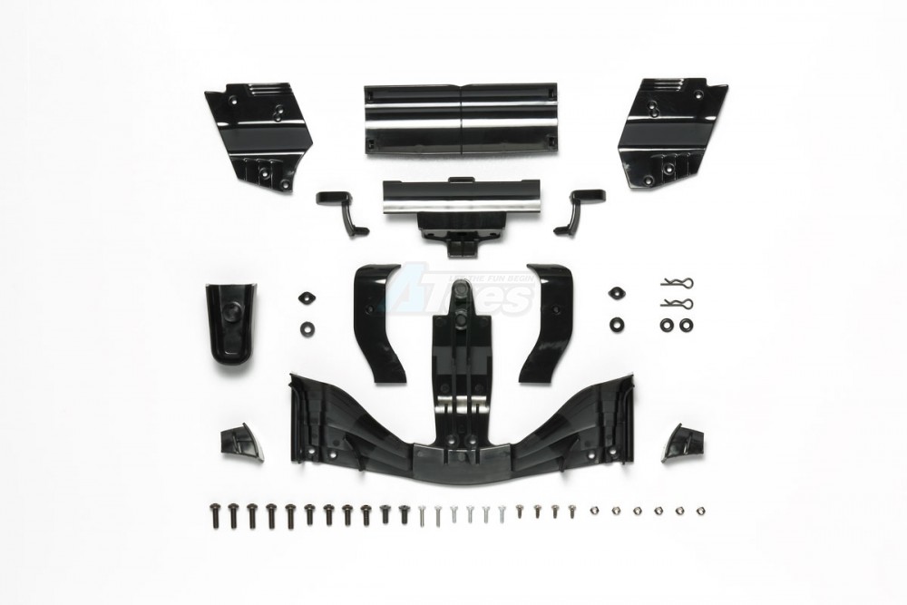• This is a spare front a rear wing set molded in black for Tamiya’s original design 2017 Formula One body. Its design is influenced by the 2017 Formula One regulations and dimensions.