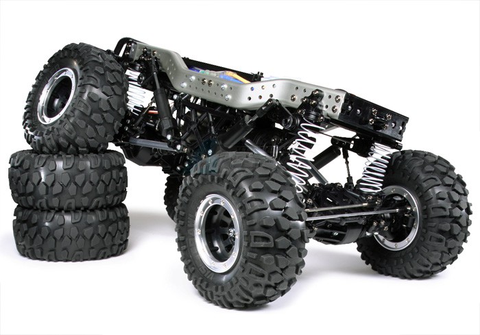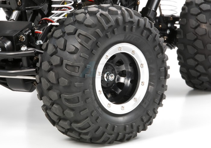 Tires feature inner sponge and tread pattern on the sidewalls to provide maximum grip in rock crawling environments. They are mounted on 3-piece beadlock wheels.