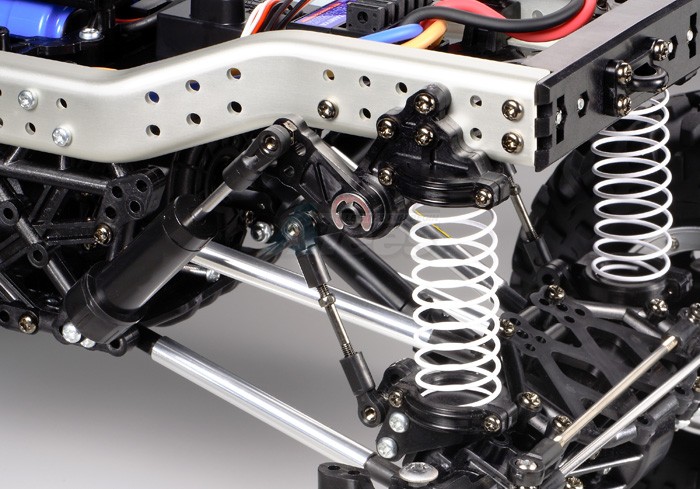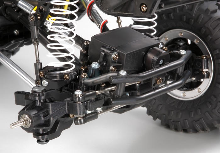 This chassis features a tough ladder frame with aluminum side channels and resin crossmembers, 4-link suspension with aluminum rods, a 4WD system with lockable differentials, massive off-road tires with sidewall tread pattern, and dependable beadlock wheels. The body is of course accurately reproduced in durable polycarbonate material, giving fans a superbly capable rock crawler with scale realism.