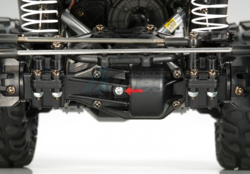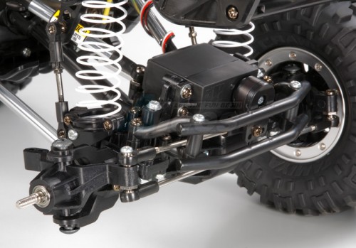 Steering servo is mounted in a servo bed above the axle in an innovative way so as to not interfere with suspension movement.