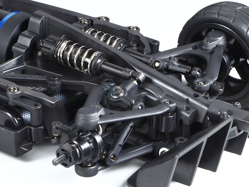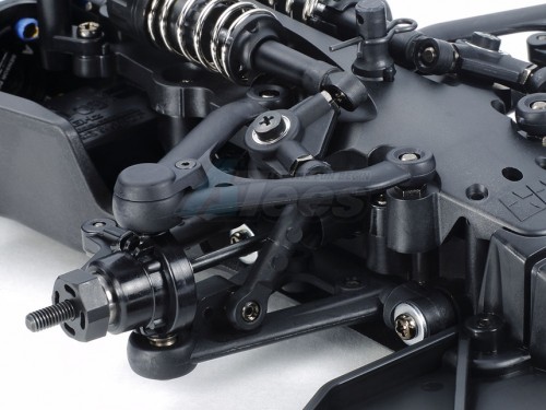 This durable composite monocoque-frame chassis provides shaft driven 4WD from a central motor via front and rear propeller shafts, with oil filled gear differentials. 4-wheel independent double wishbone suspension employs long arms, plus inboard setups front and rear with oil shock-dampers actuated by push rods and rocker arms to allow the use of low-profile bodies. Adjust spacer width to easily alter camber, skid and toe angle settings. Both suspension arms and uprights are identical left, right, front and rear, for more efficient maintenance and pit work.