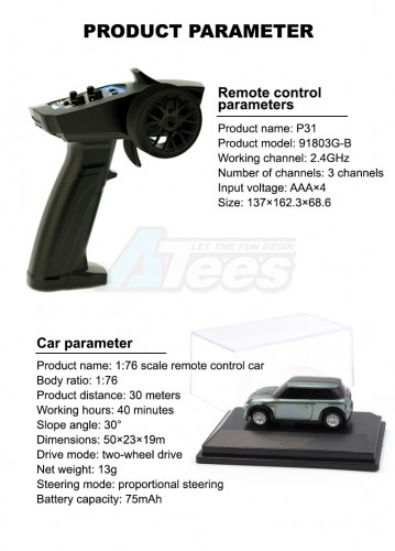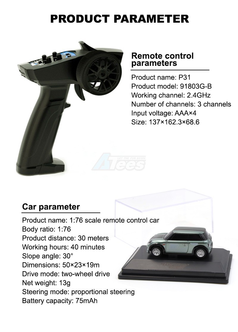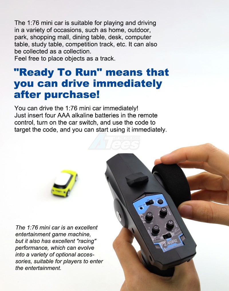 The 1:76 mini car comes ready to play immediately! Just insert four AAA alkaline batteries in the remote control and you’re ready to go.
