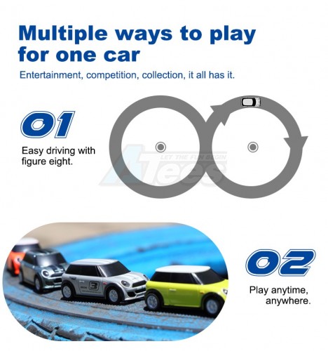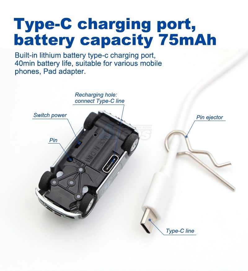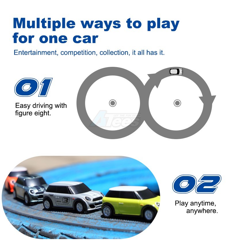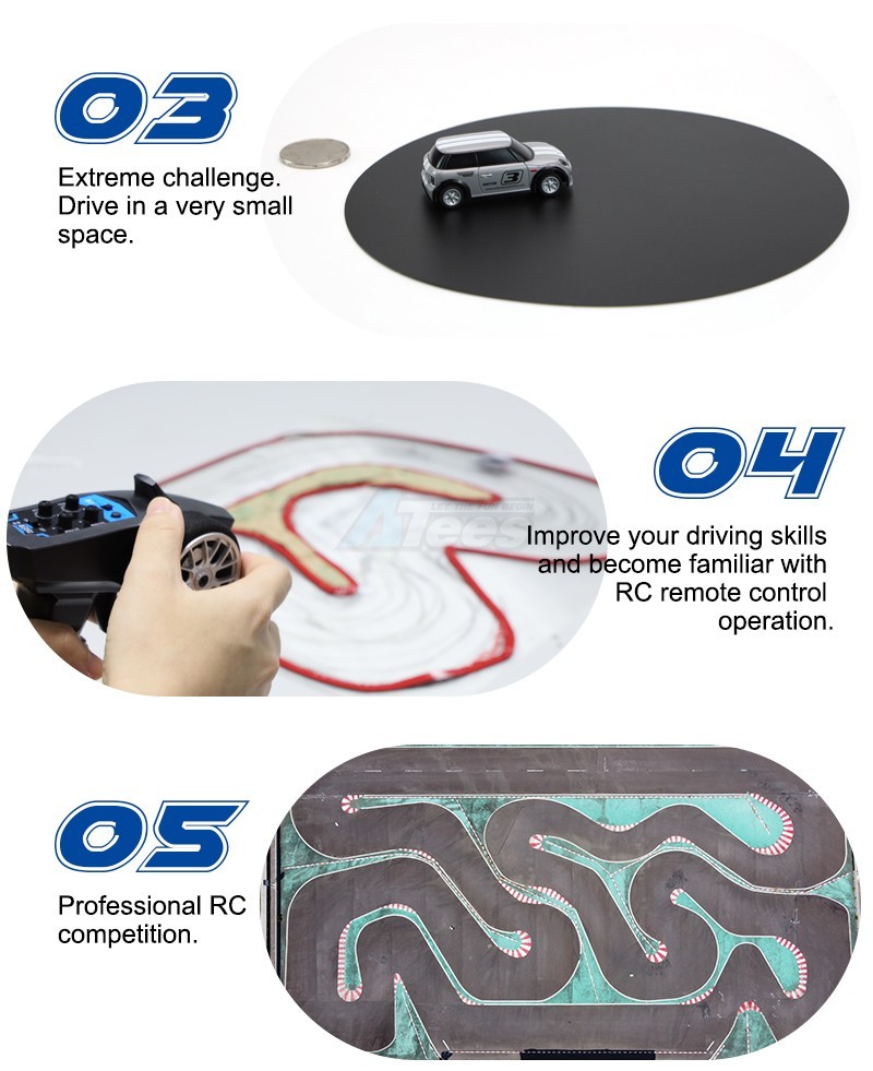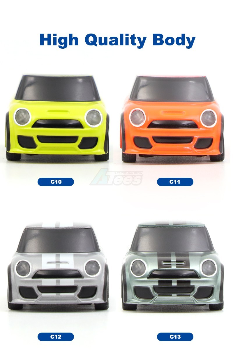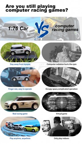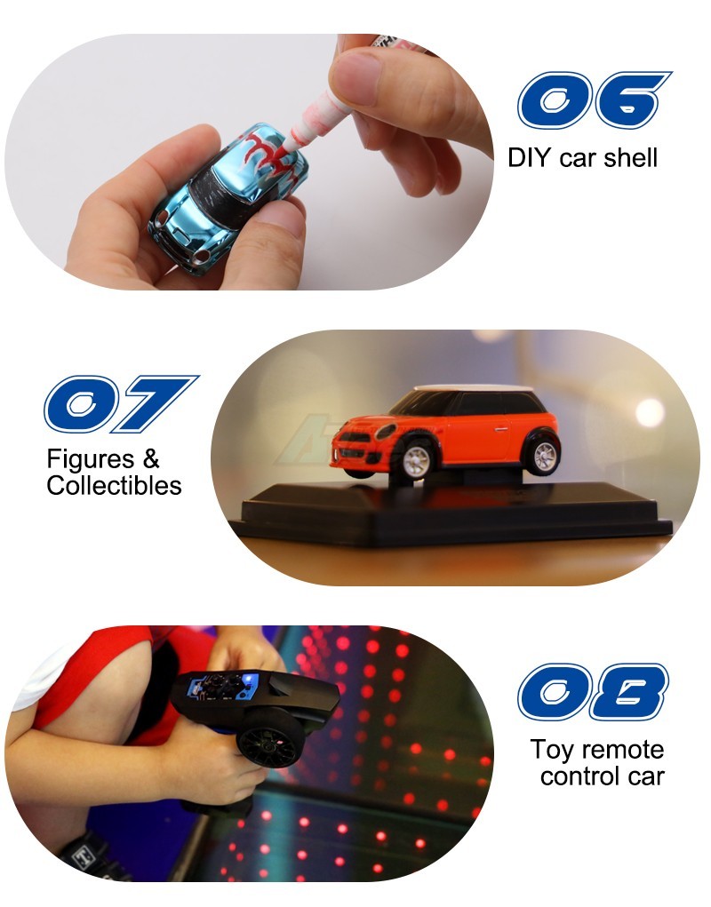 A lithium battery provides the power and speed for great performance and lots of fun. Race these finger-sized RC cars anywhere, such as homes, shopping malls, dining tables, desks, study tables, competition track, etc.