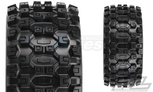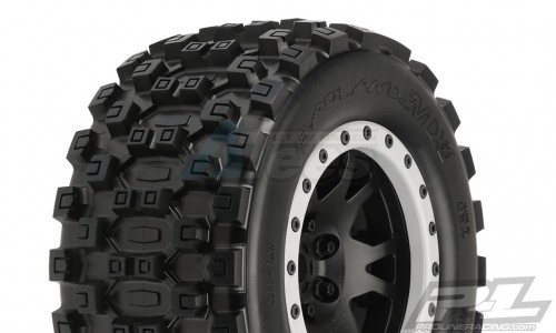 This is a pair of pre-mounted Badlands MX43 tires for X-MAXX®. Pro-Line is ready to unleash the long-awaited tire solution for X-MAXX® owners with the Biggest and Baddest tire and wheel combo ever conceived: the Badlands MX43 mounted on Impulse Wheels! Pro-Line Badlands tires are known for having a sweet Motocross inspired tread and the all-new Badlands MX43 tires kick that up a notch with a Bigger and Bolder knobby tread that matches modern MX tire design. These tires have been developed from the ground up for extreme X-MAXX® punishment with an all-new ultra-durable compound that prevents tire ballooning even at high speeds. The Badlands MX43 features Pro-Line's groundbreaking proprietary Pro-Loc Technology that creates an ultra-secure bond to Pro-Line's Impulse Pro-Loc X-MAXX® wheels while still being removable when required. The Badlands MX43 is a true All-Terrain tire that will find traction on any surface but is best suited for loose & loamy dirt, mud, or grass. Just imagine your X-MAXX® throwing up huge rooster tails with these aggressive looking tires!
