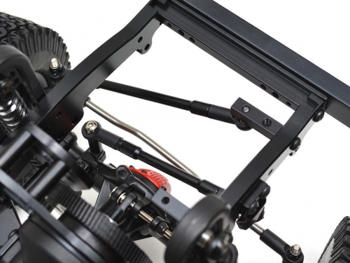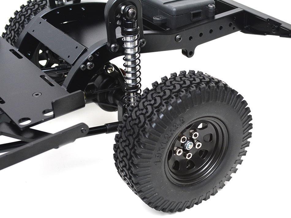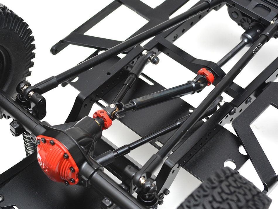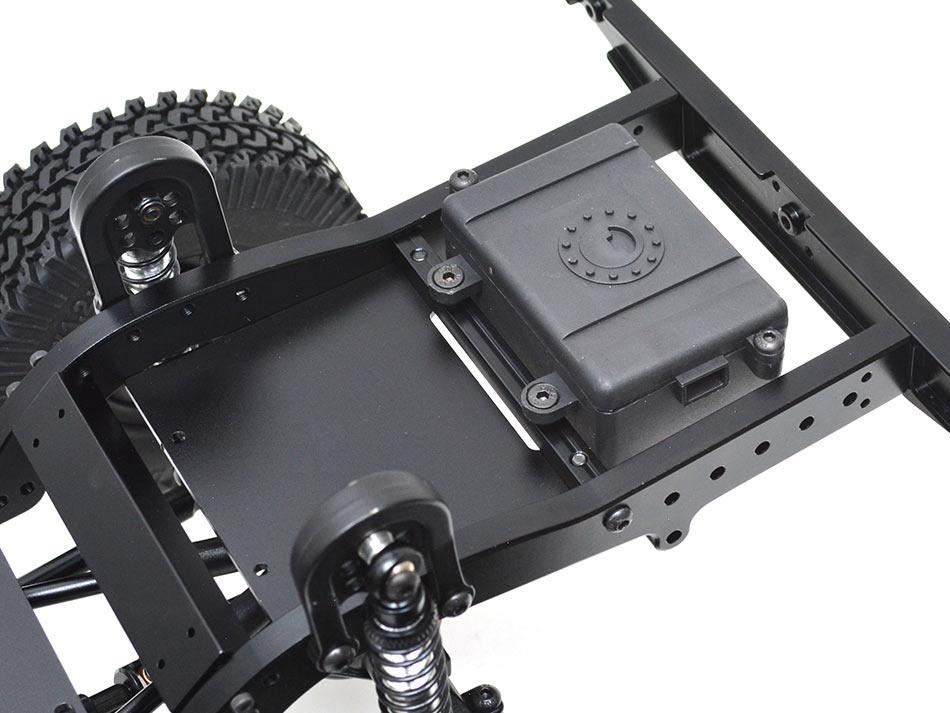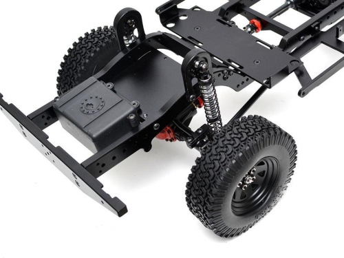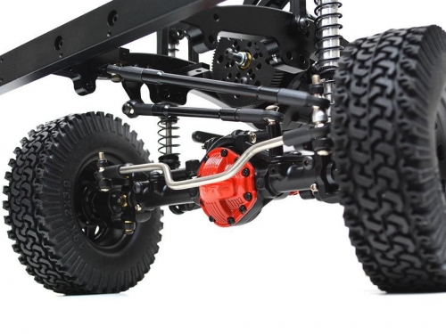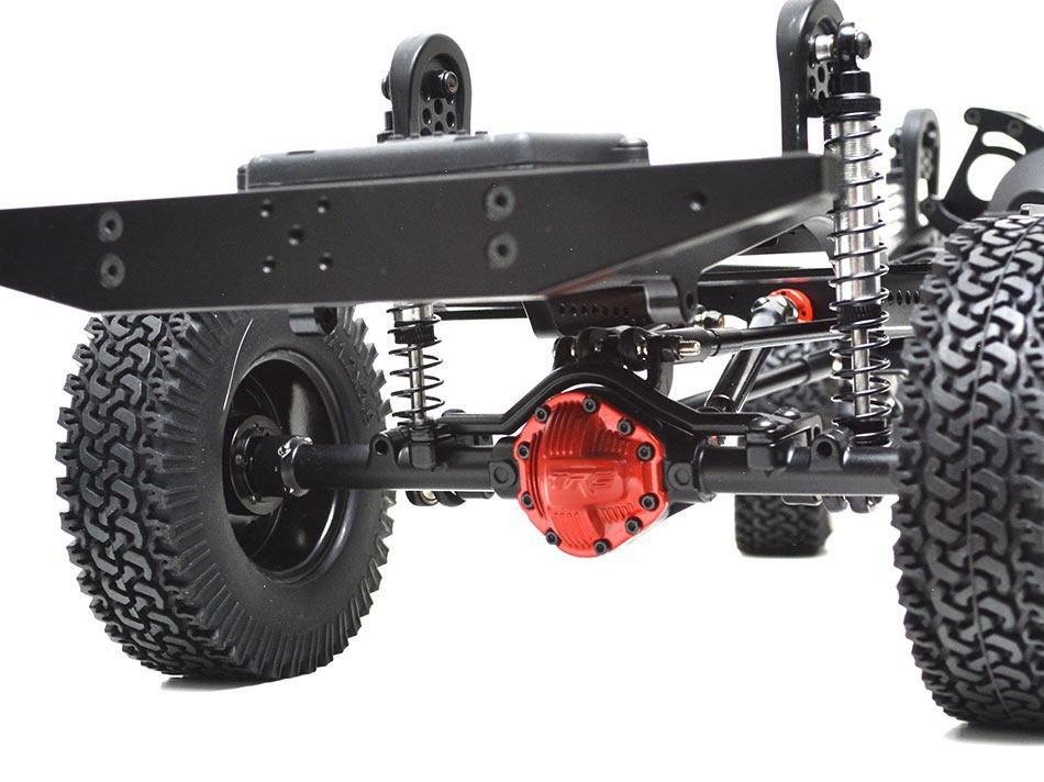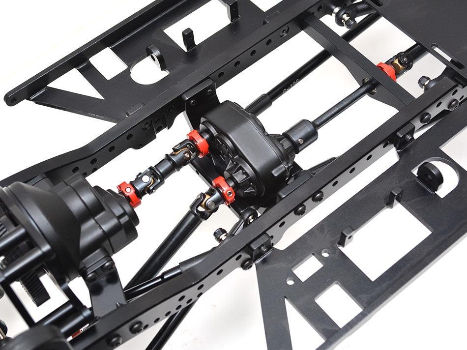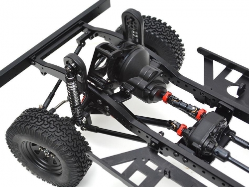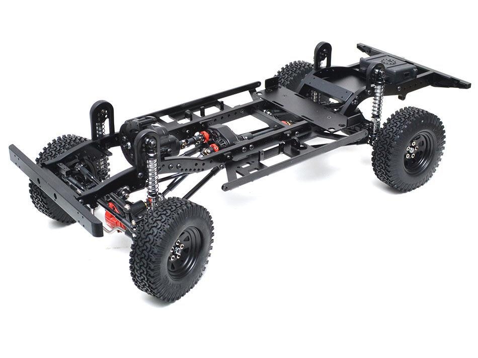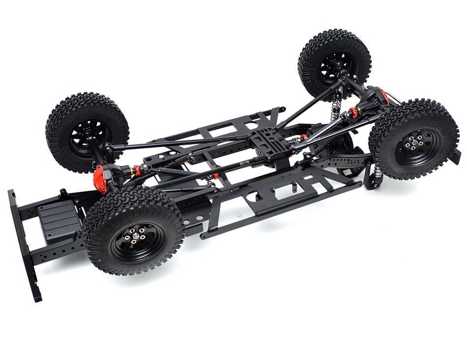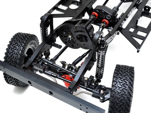 The chassis includes Team Raffee Co. Complete Scale Axles, Steel front, and rear driveshafts, driveshaft from the motor to transfer case, aluminum shocks, 1.9 Beadlock wheels and tires, transmission, T-case, aluminum links, HD gears, battery plate, body mounts, skid plate, aluminum links and plastic ball ends, rails and bumpers, shock towers and receiver box. The body is also included.