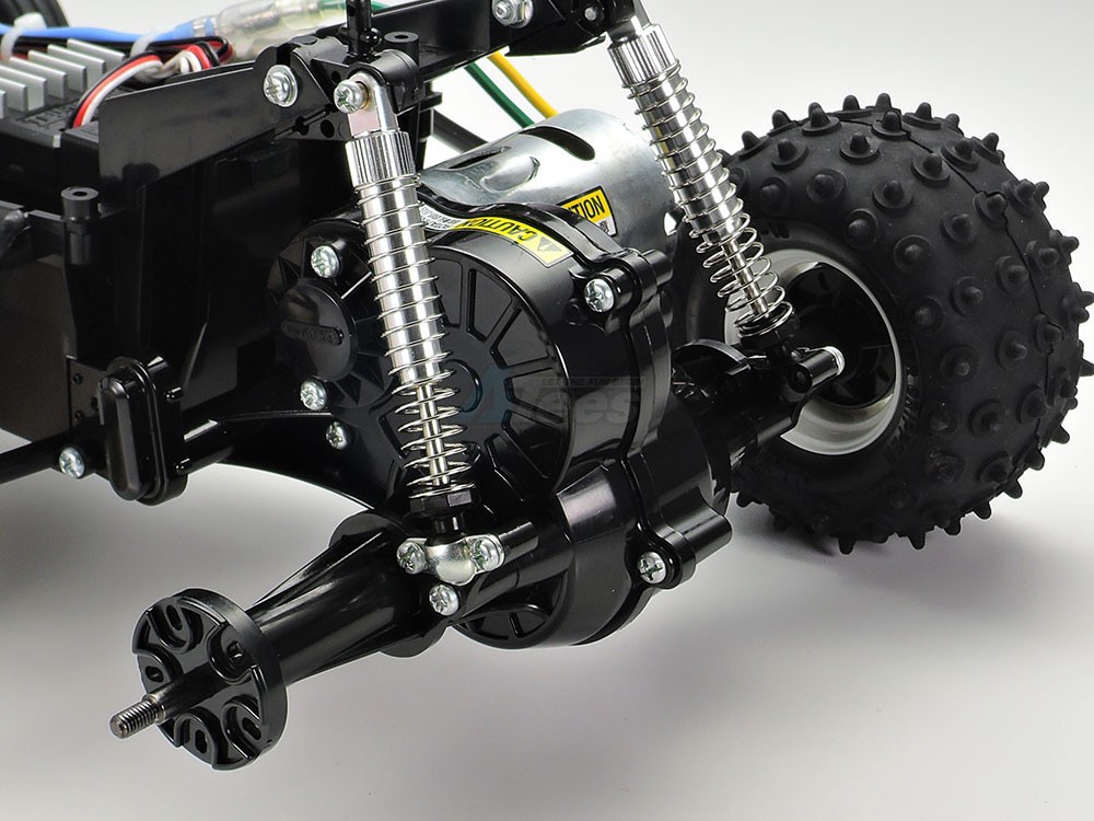 The model's lightweight and durable chassis is based around a bathtub-type frame. It features front swing-axle suspension with friction dampers, while the rear is cushioned by a rolling rigid axle setup and oil dampers for excellent shock absorption. The differential is enclosed in a sealed gearbox to ensure that dust and dirt stay outside, allowing it to continue providing smooth cornering. Three-piece wheels give the car authentic buggy looks, with grooved front tires and rear spike tires guaranteeing superb performance on- and off-road.