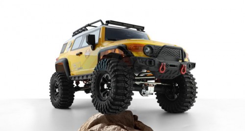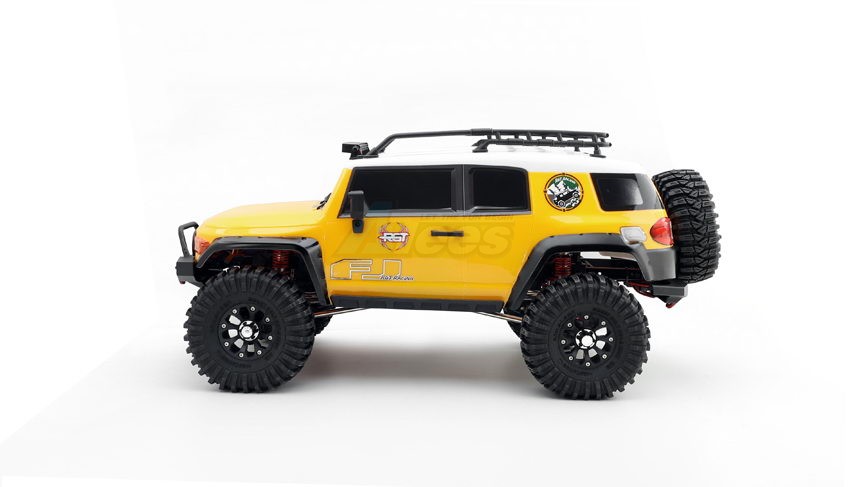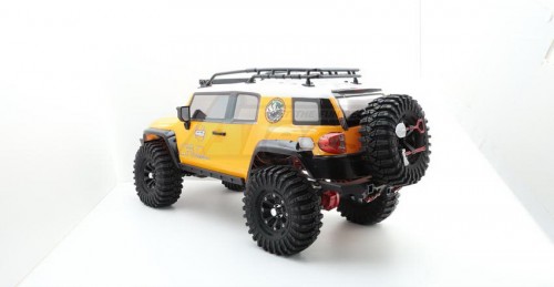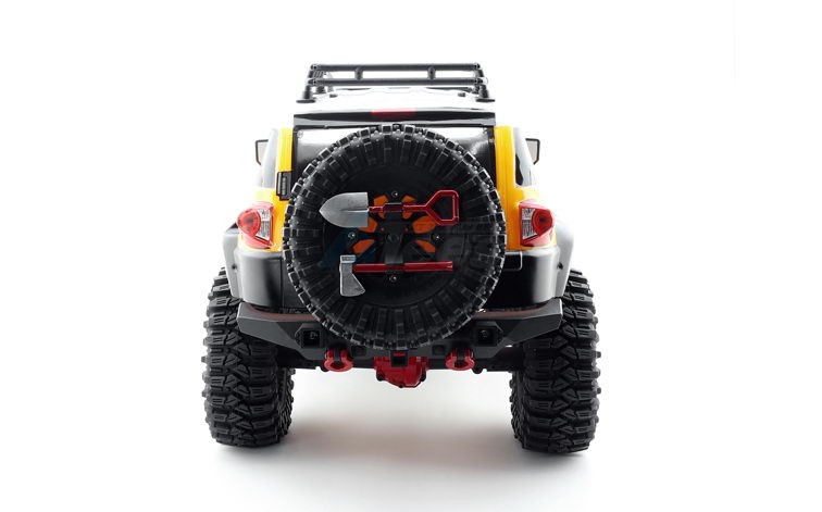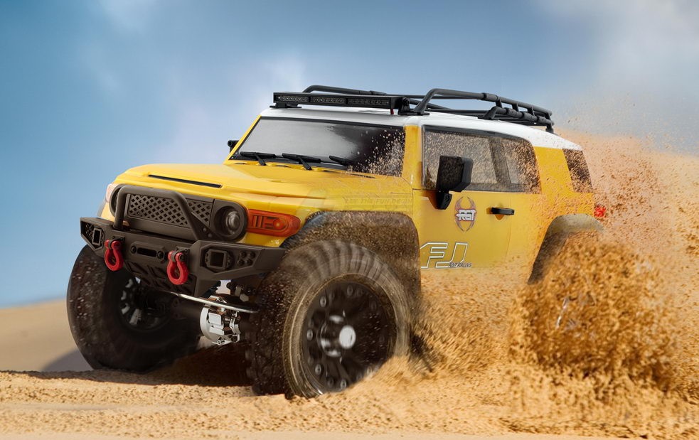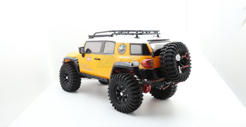 Desert Fox follows the FJ Cruiser classic style. The bodyshell uses the environmental protection paint PC softshell and has three colors for option (gray, blue, and yellow). The body accessories have the spare tire, roof rack, rack lamp, foot pedal, grill, LED cornering lamp, headlight with the angle eye function, rear-view mirror, wiper, handle, ax and shovel, etc. Also, the simulated front and rear bumpers, and the hidden front body post, make the overall car more beautiful!