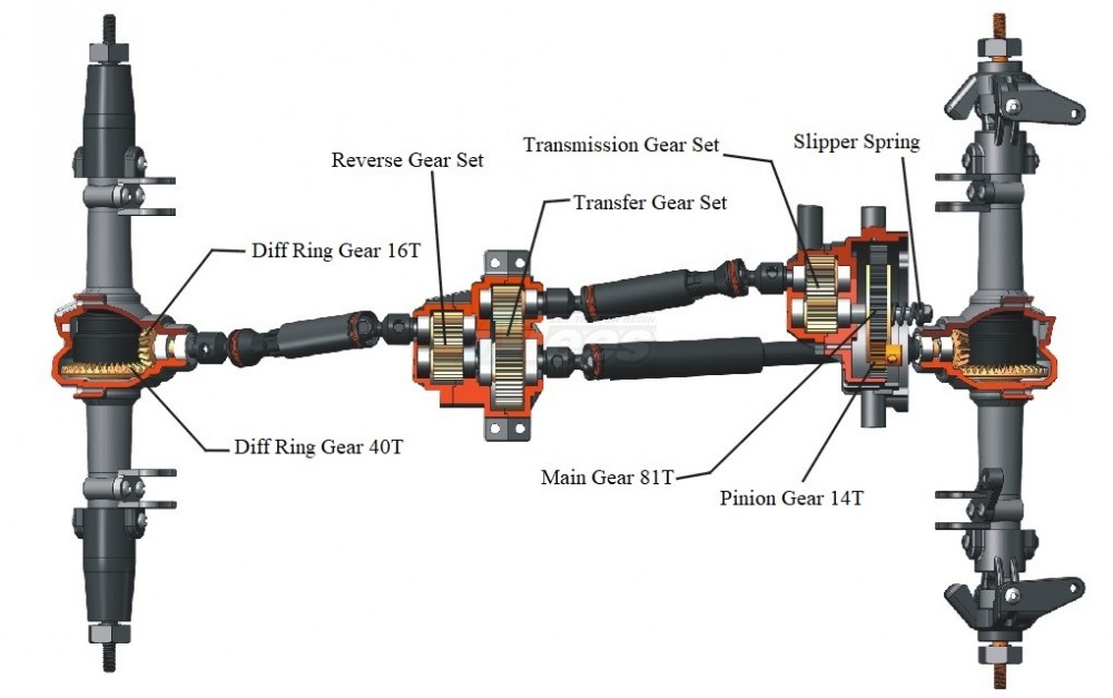 Reverse Drive System:The Central Transfer Case adds the reverse gear set, then the front and rear driveshaft connected to the gearbox will rotate in a different direction. So, when the Trample is running, the front driveshaft rotates in a clockwise direction, and the rear driveshaft rotates in an anticlockwise direction. The reverse drive design can well reduce the axle effect during running. More, it will really solve the whole balance, foot-lifting, head-up, rollover, and so on.