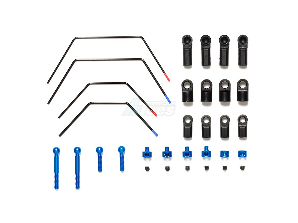 Stabilizer indispensable for suspension setting. Depending on the course layout and running speed, you can quickly adjust the roll characteristics of the machine. An adjust rod and stabilizer stopper that make it easy to adjust the left and right balance are also included. Two types of hardness are available for both front and back.