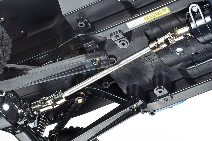 The chassis suspension employs double-wishbone front upper single links and lower H-shaped arms plus rear rigid suspension. With 4 CVA oil dampers in total fitted to the front and rear, there's enough cushion to take on even the roughest surfaces. It also looks the part, with cool black dish-type wheels, plus 94mm-diameter block tread pattern tires.