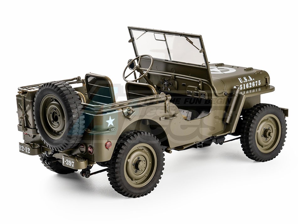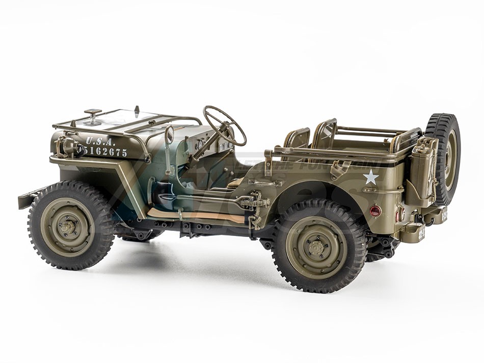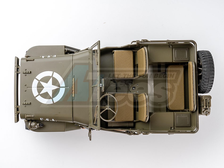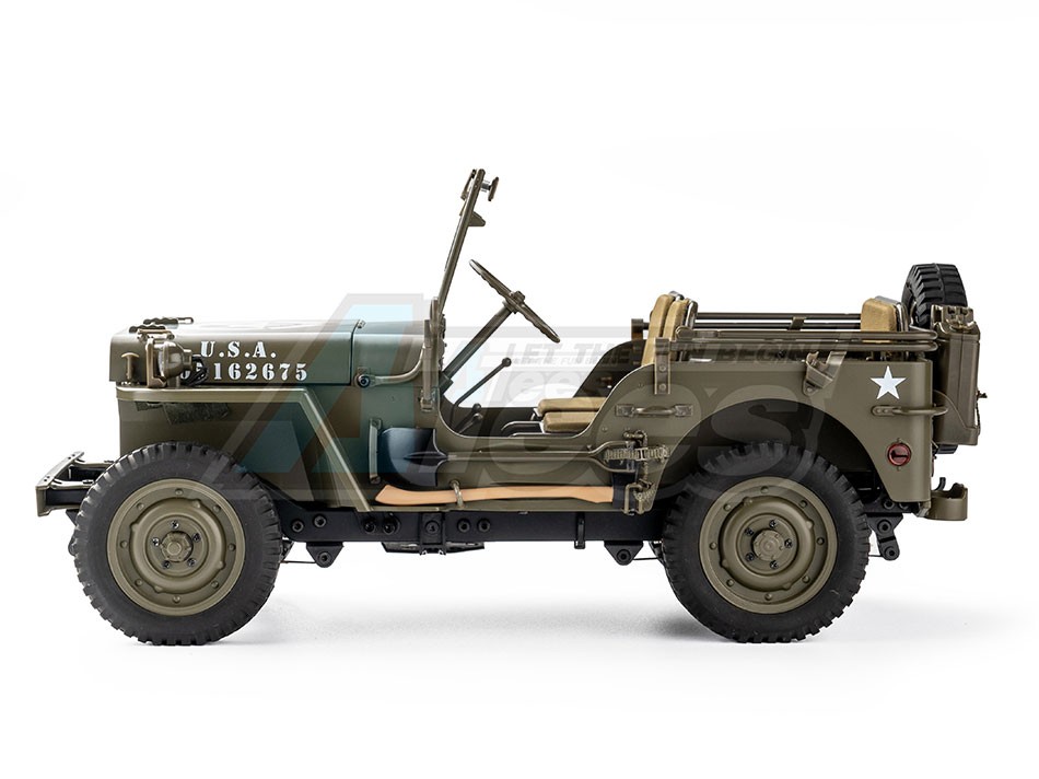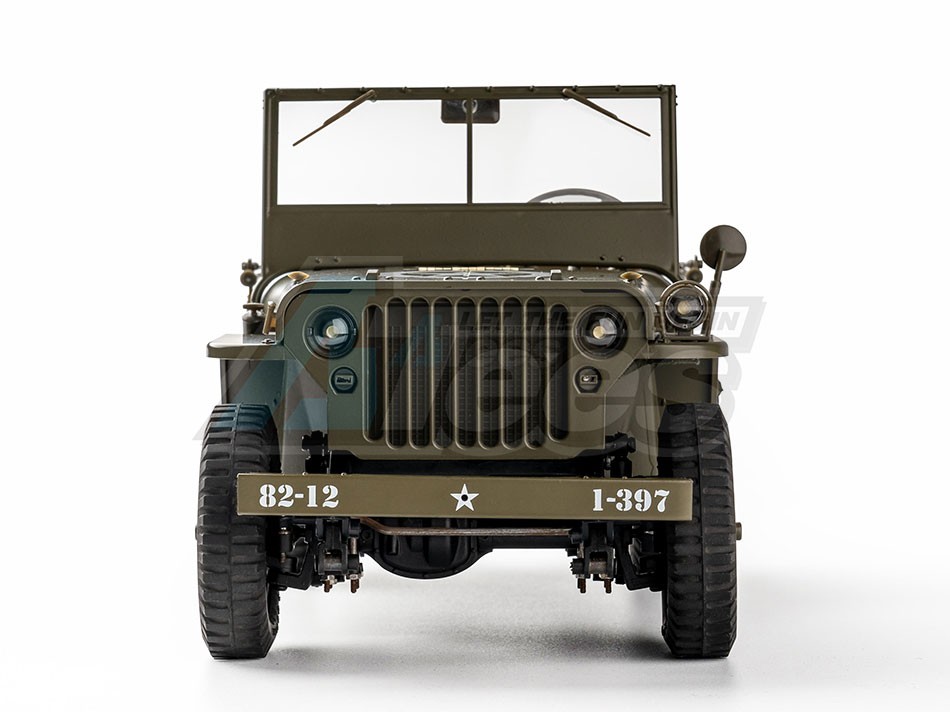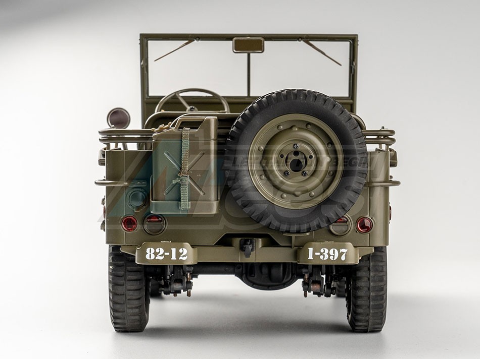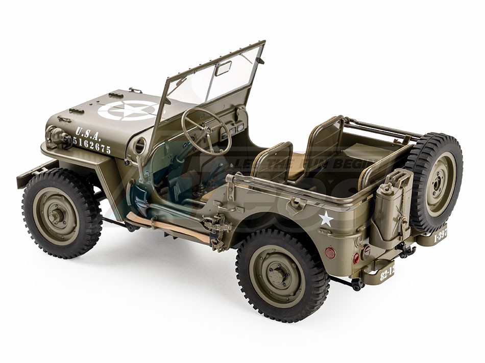 However, the 1:12 1941 Willys MB features even more. More Details — such as lifelike canvas seats, a fold-down rear seat with openable bins, and tires with stunning scale tread patterns. More Realistic — the Willys MB chassis features a solid ladder frame rail that mirrors its full-size counterpart, multi-leaf springs with dampers as well as offset differentials, making this vehicle exquisitely equal to the legendary historical Willys. More Versatile — the Willys MB features a fantastic LED system (four turn lights, two headlights, and a blackout lamp) that helps explore the dark of night.