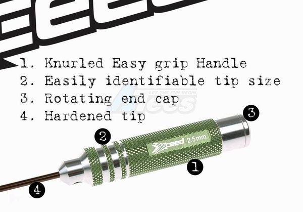 Xceed RC Products have announced the release of their extensive range of high quality tools specifically designed for use with R/C cars. Featuring a lightweight green anodized hollow aluminum handle, the surface has been knurled for better grip in the hand while the top sports a rotating end cap for better comfort during use.