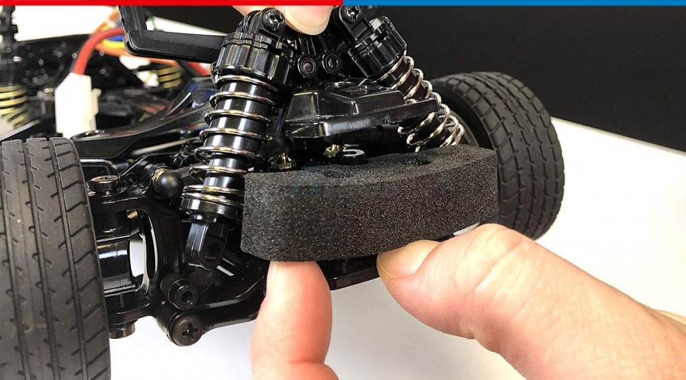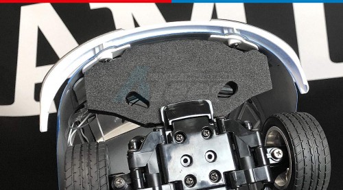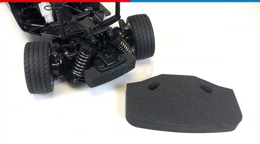 • A big size front bumper that can be cut and used according to the body. By minimizing the gap between the bumper and the body, the fluttering of the body is suppressed. The black color tightens the image of the chassis.