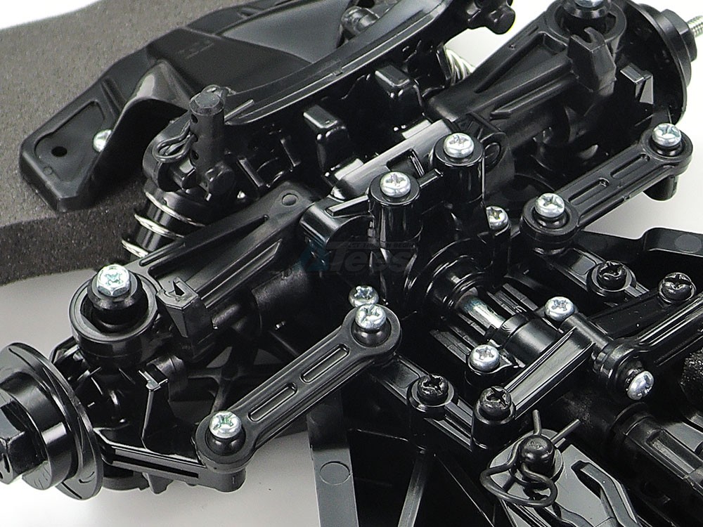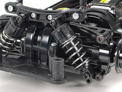 The shaft-driven 4WD TT-02 chassis employs a longitudinal layout with the battery on the left and the motor on the right, to give excellent stability. In addition, it features identical left and right suspension arms and uprights for ease of assembly, plus easy-to-maintain gearboxes.