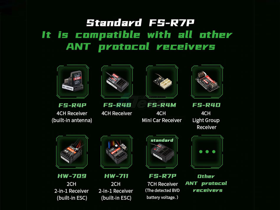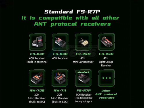 - Factory description: Fly Sky 2.4GHz 7CH ANT Protocol Radio Transmitter w/R7P Receiver x2