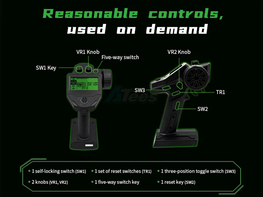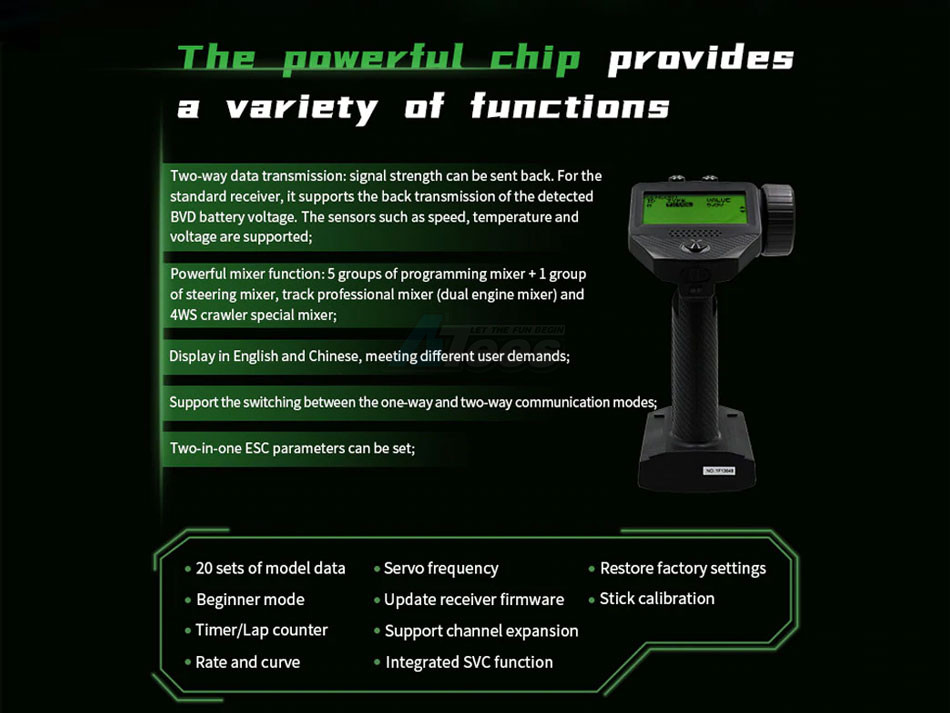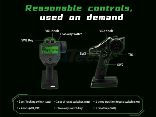 - Powerful mixer function: 5 groups of programming mixer + 1 group of steering mixer, track professional mixer (dual engine mixer) and 4WS crawler special mixer