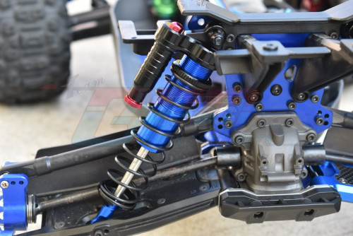 GPM Racing Aluminium 6061-T6 Front L-Shape Emulation Piggy Back (Built-In Piston Spring) Adjustable Spring Dampers 128MM (95076-4) - 2Pcs Set Blue for Traxxas Sledge