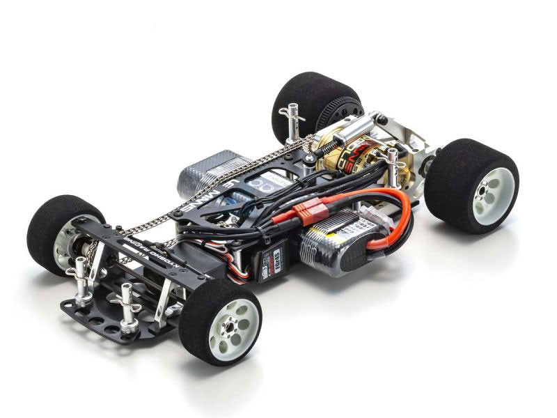 Kyosho was the first to introduce the chain + one-way 4WD system developed for 1/8 engine models into 1/12 electric racing cars. The front one-way system enabled power to be applied earlier through corners, allowing for more aggressive driving. On the other hand, energy efficiency didn’t improve and it was prone to stalling when power was taken off.
