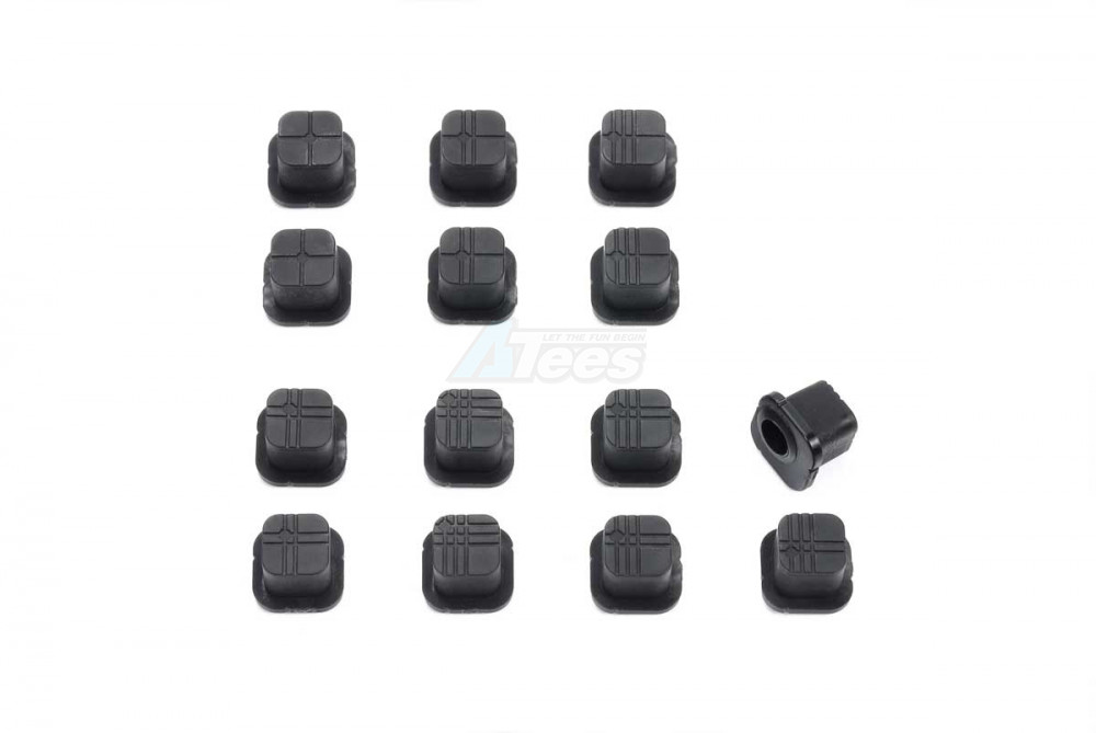 • The bushings sprue contains 7 pairs of different bushing types, each type with a different hole for the suspension shafts, giving a total of 25 potential shaft offset positions, and a range of toe, roll center and skid angle setups.