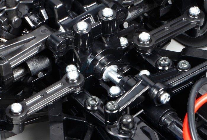 The shaft-driven 4WD TT-02 chassis employs a longitudinal layout with the battery on the left and the motor on the right, to give excellent stability. In addition, it features identical left and right suspension arms and uprights for ease of assembly, plus easy-to-maintain gearboxes. It is a highly adaptable chassis, as it offers 2 different wheelbases, 2 ground clearance settings and 2 tread set-ups in addition to a range of 10 possible gear ratios. It is not short on looks either, with brake disc-shaped wheel hubs and stylish front bumper supports. Gun metal color mesh wheels are paired with radial tires.