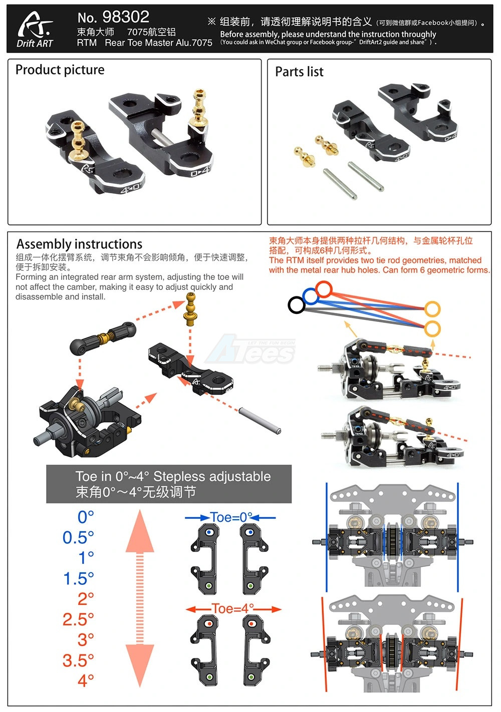 • Factory description: Drift ART Drift ART DA3 RTM Rear Toe Master Alu. 7075 (Rear Arm Toe Mount)