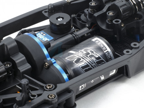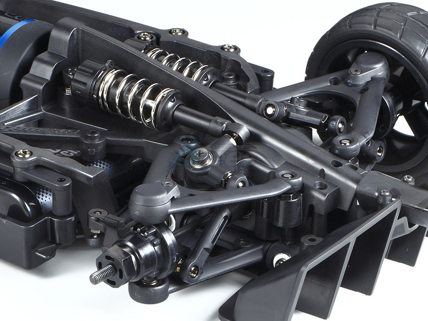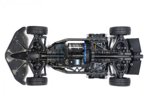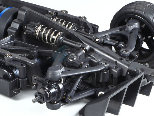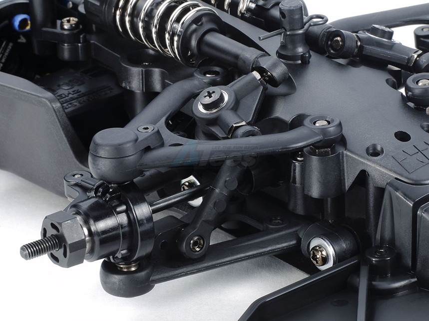 This durable composite monocoque-frame chassis provides shaft-driven 4WD from a central motor via front and rear propeller shafts, with oil-filled gear differentials. 4-wheel independent double wishbone suspension employs long arms, plus inboard setups front and rear with oil shock-dampers actuated by push rods and rocker's arms to allow the use of low-profile bodies. Adjust spacer width to easily alter camber, skid, and toe angle settings. Both suspension arms and uprights are identical left, right, front, and rear, for more efficient maintenance and pit work.