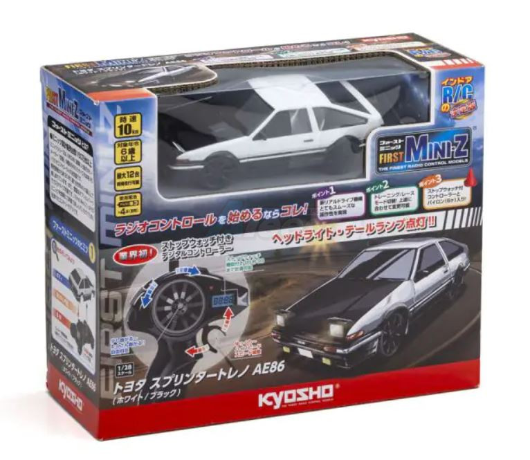 • Factory description: Kyosho Mini-Z 1/28 First Mini-Z Trueno AE86 Carbon Bonnet (White/Black) Readyset