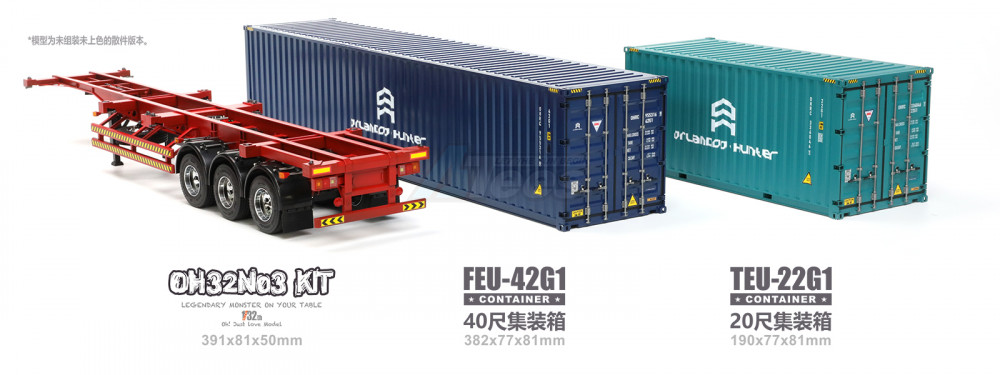 - Factory description: Orlandoo Hunter Model OH32T01 SCANIA R650 1/32 Container Skeletal Trailer Kit