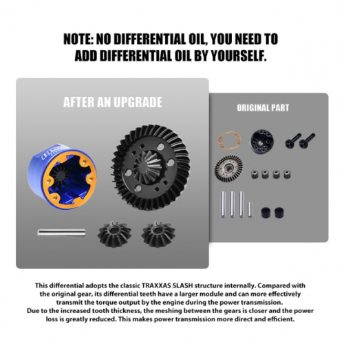 This differential adopts the classic TRAXXAS SLASH structure internally. Compared with the original gear, its differential teeth have a larger module and can more effectively transmit the torque output by the engine during the power transmission. Due to the increased tooth thickness, the meshing between the gears is closer and the power loss is greatly reduced. This makes power transmission more direct and efficient.