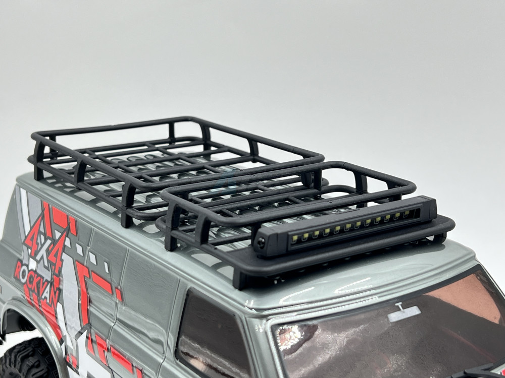 - Full-length roof rack with integrated high-visibility LED light bar (RockVan)