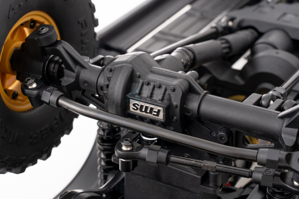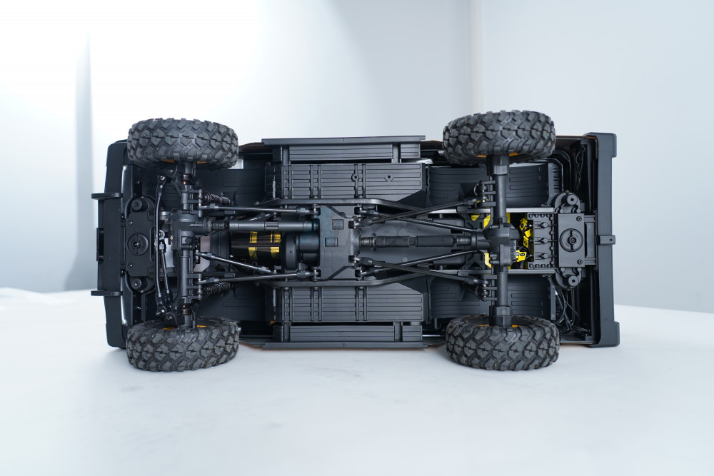 Underneath, the FCX10 chassis features a front-center motor layout and four-link suspension. Straight axles at the front and rear improve traction and stability. The combined motor and transmission unit sits low in the chassis to reduce the center of gravity and minimize rollovers. A waterproof metal-gear servo mounted beside the battery tray controls the two-speed transmission.