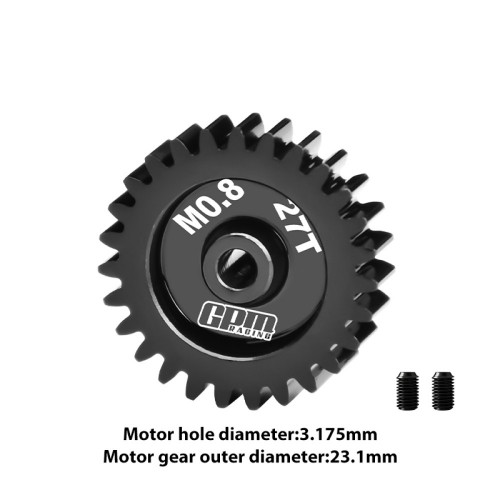 Factory description: GPM Racing 40CR Steel Motor Gear 27T (32 Pitch,Module: 0.8mm,Motor Tooth Diameter: 3.175mm)