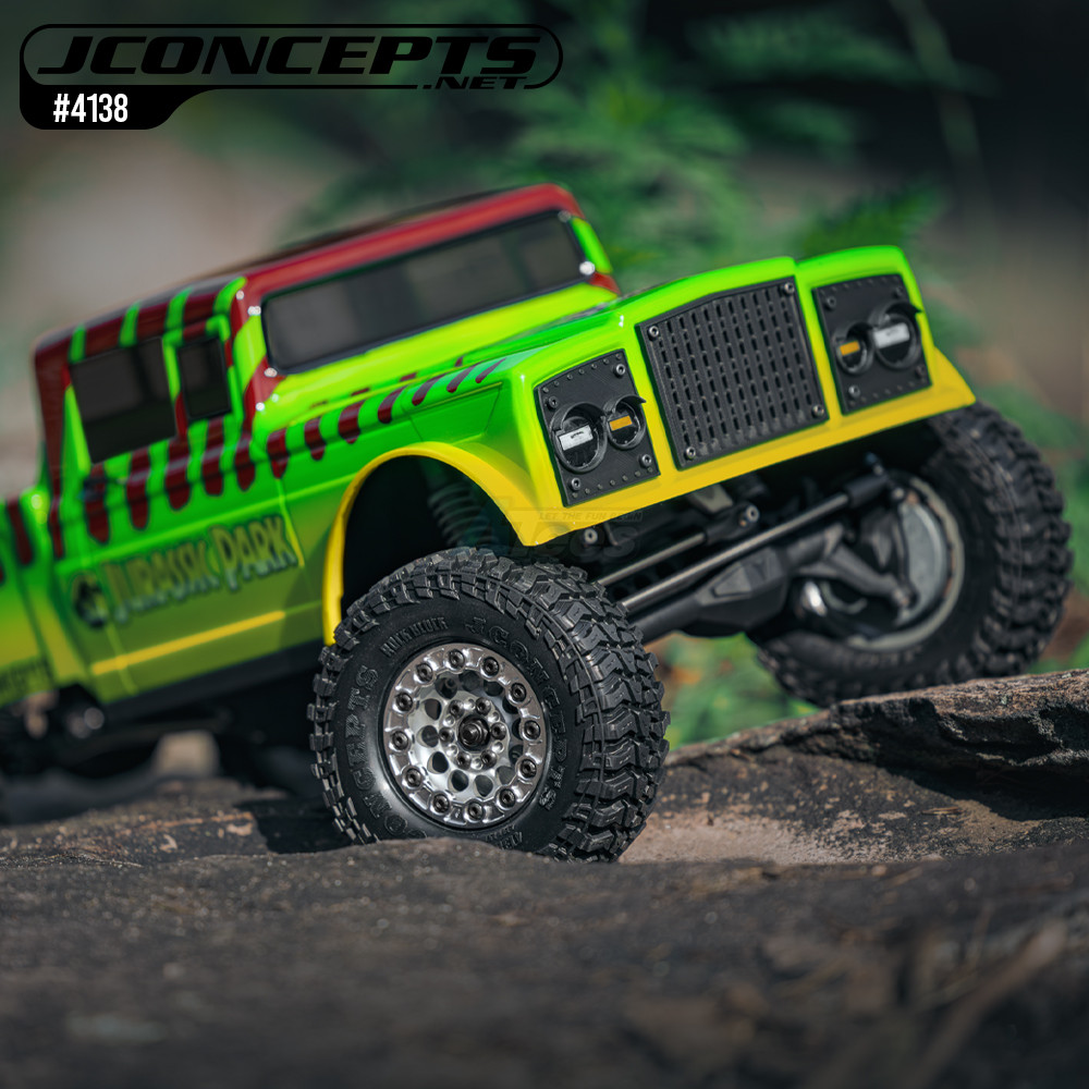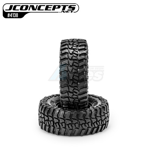 Momentum based sidewall attributes have a progression pattern consistent with forward direction. The main ingredient in the sidewall, the low height wear bar ribs connect everything together to help function as a single until during tight climbs and narrow spaces. Recessed cuts in the blocks, extrusions in timely areas help detail out one of the most sophisticated crawling tires in the JConcepts line-up. Recessed JConcepts logo with inner hatching takes position in multiple areas while the tire name, part number 4138 L/R is marked for easy identification.