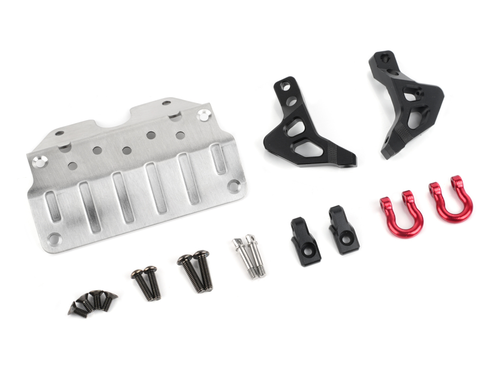 • This is a full set of front skid plate with d-ring shackles, pins, and aluminum mounts. The skid plate is made of stainless steel for durability and strength. D-ring shackles and mounts are CNC aluminum. D-rings are anodized in red color. Includes 12.9 grade hardware for installation.