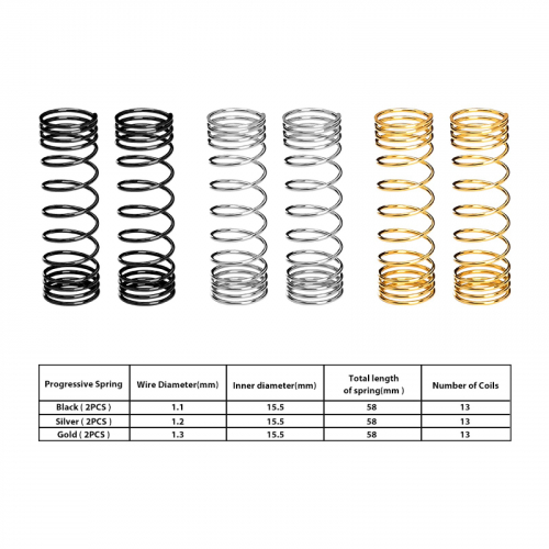 • Progressive Spring Gold (2PCS): Wire Diameter (3mm), Inner diameter (15.5mm), Total length of spring (58mm), Number of Coils 13