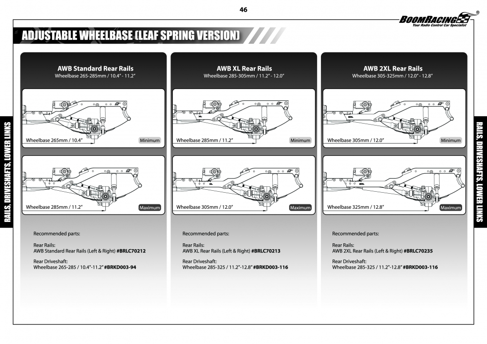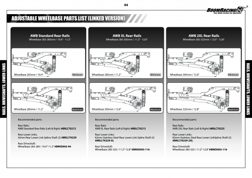 Recommended KUDU shaft sizes for the BRX01 AWB based on different wheelbase lengths: