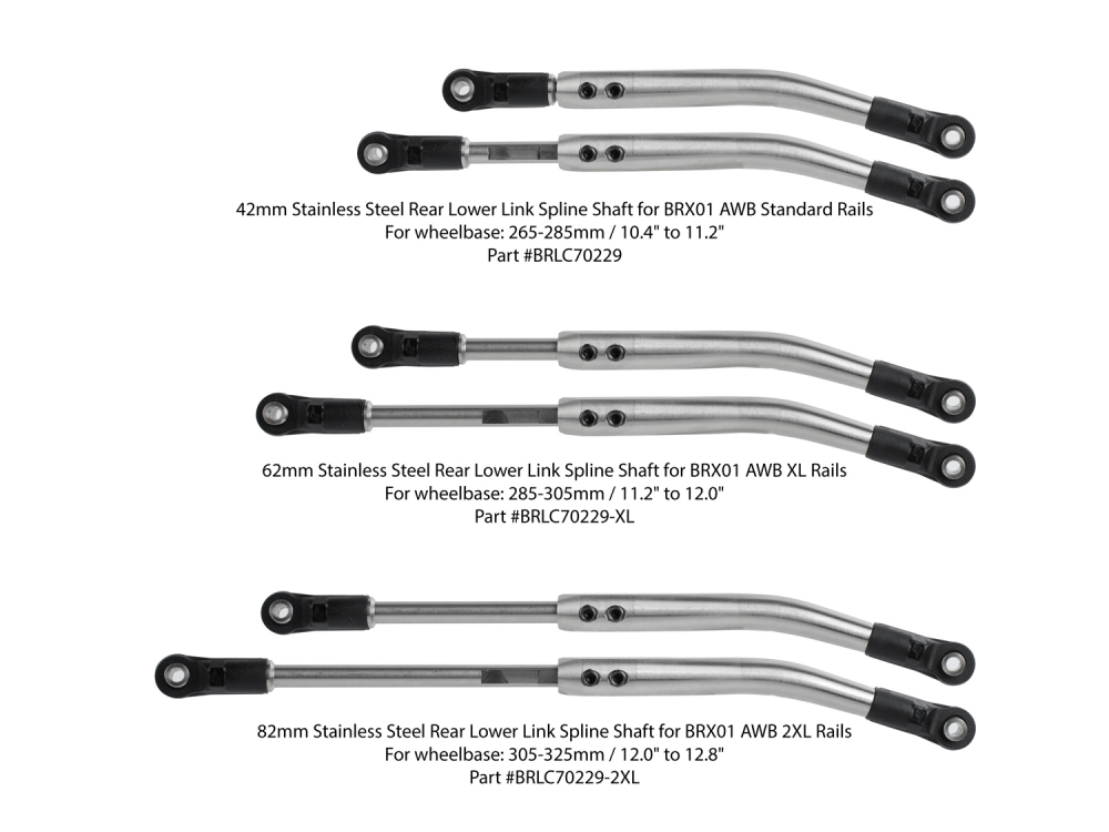 • This is a pair of adjustable stainless steel rear lower link barrels for the BRX01 AWB Link chassis. Depending on your desired wheelbase, select and adjust the length based on the range of each spline shaft.
