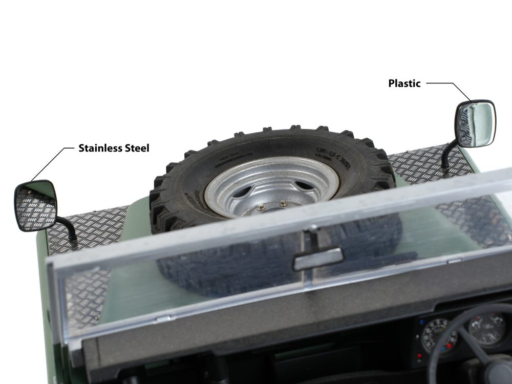 • This is a set of stainless steel mirror-finish side and rear mirror plate set for the Land Rover Series II bodies. Gives a more realistic and clean look to the mirrors.
