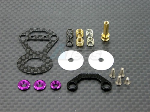 Factory description: GPM Racing Kyosho Mini-Z MR-02 GRAPHITE+DELRIN STABILIZED FRICTION EQUIPPED SET WITH ALLOY POST, FIBER PLATE, 4.2MM COIL (0.2MM, 0.4MM, 0.5MM)-3PRS, WASHERS & SCREWS(REPRESENTATION OF REAR DAMPER INSERTED)-1SET