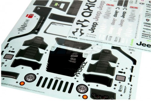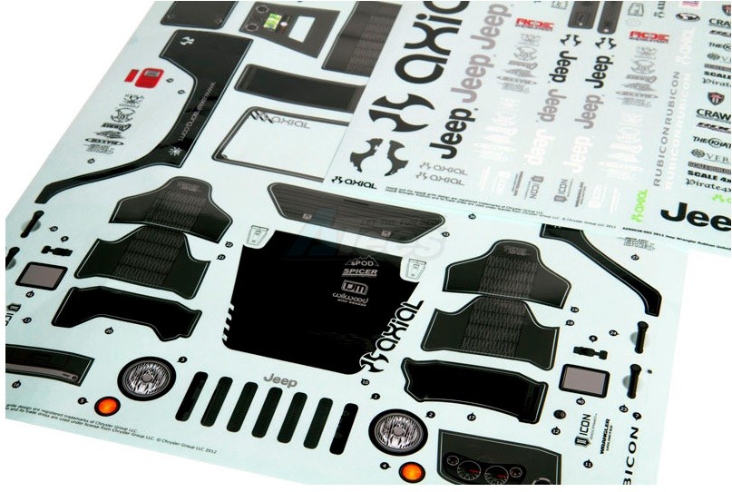 - Axial’s newest body release is a fully licensed 2012 Jeep® Wrangler Unlimited Rubicon; a 1/10th scale version of the real thing. The Jeep® brand is synonymous with the off-road lifestyle, a lifestyle Axial promotes as well. But, Axial didn’t stop there. They went a step further and added several “off-road worthy” components such as a 1/10th scale custom roll cage and scale Poison Spyder “Crusher Flares” to complete that hardcore off-road look. Also included are molded plastic tail lights, steering wheel, shifter and side view mirrors. The body is molded in tough .040" polycarbonate plastic and it comes clear so you can paint it in your favorite colors