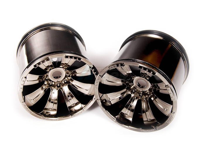 Go big with the new Axial 8 Spoke Oversize monster truck wheels. All Axial wheels are made from super strong composite material and come in several high quality finishes so you can customize the look of your truck. The 17mm hex is fast becoming the standard for super strong durability and light weight performance. For those that don’t want to step up to the 17mm just quite yet all the Axial wheels include an adapter set that allows you to fit them to current 14mm hex hubs. The 8 Spoke Oversize wheels will fit directly on to most 1/8 scale vehicles and fit all Axial Oversize Tires as well as Pro-Line 40 series